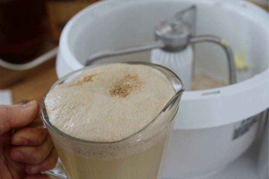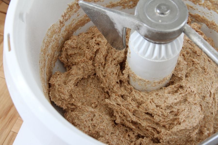 - In a bread mixer, place butter, salt and apple vinegar and 4 C freshly ground flour