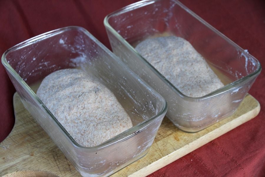- Grease two bread pans and pop your formed loaves into them.
