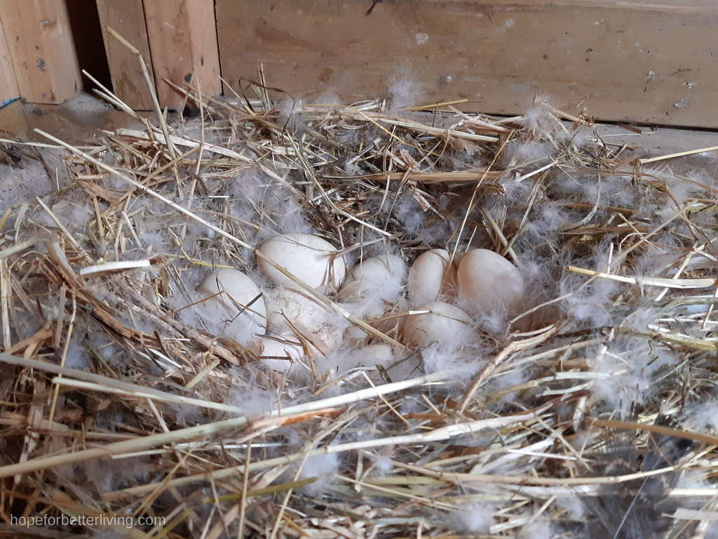After constructing her nest, a hen's final pre-brooding act is to pull out some of her own downy breast feathers. She uses these to create a soft lining in her nest. Once accomplished, she's ready to brood!