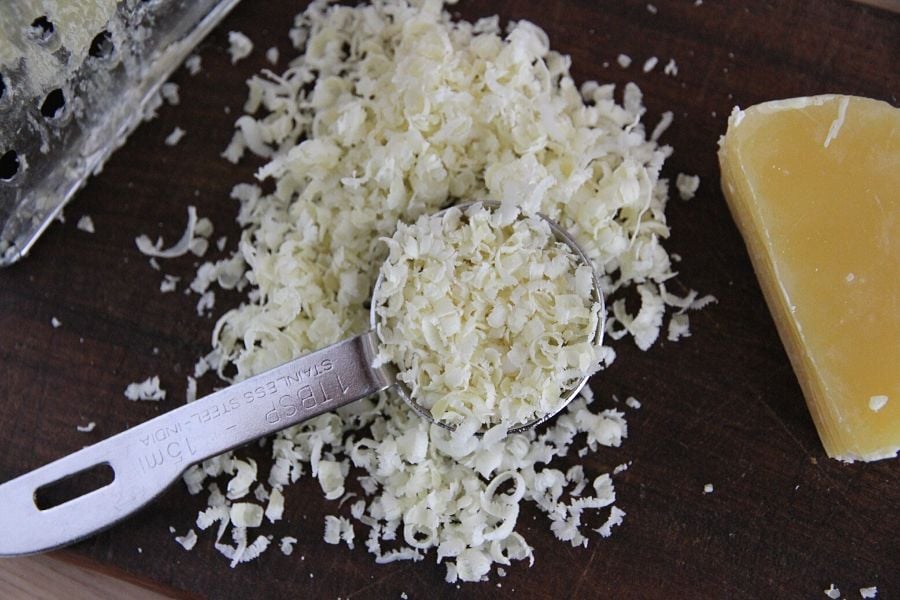 - 0.20 ounces (5.6 g) grated beeswax or pellets