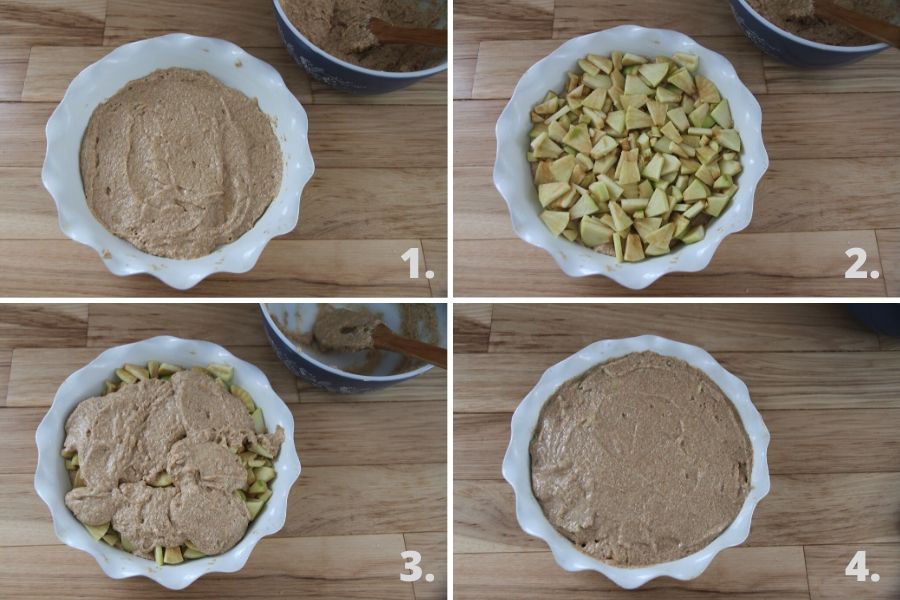 Take your freshly-made batter and place 1/3 of it on the bottom of your buttered pie plate. Smooth it out. Evenly spread the apple slices on top, then cover your fruit with the remaining batter. It too, should be smoothed out.