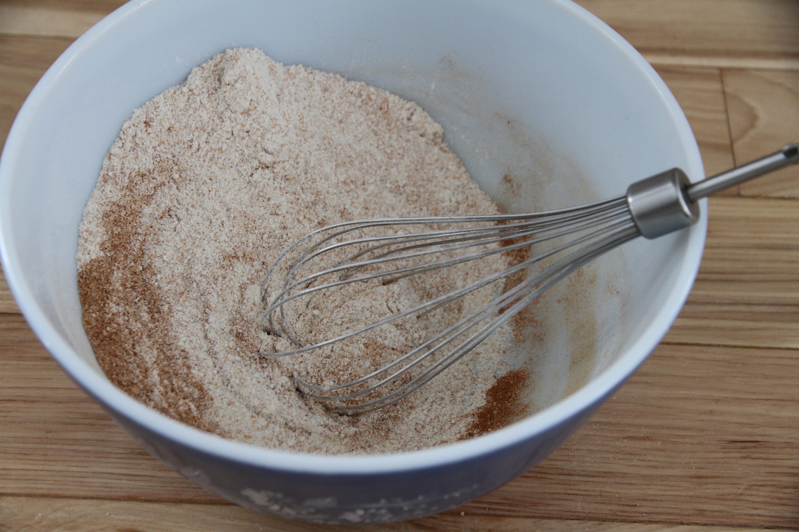Before you measure out your whole wheat flour, remember to fluff it with a whisk! Measure it into a bowl, along with the other dry ingredients. Whisk them all together.