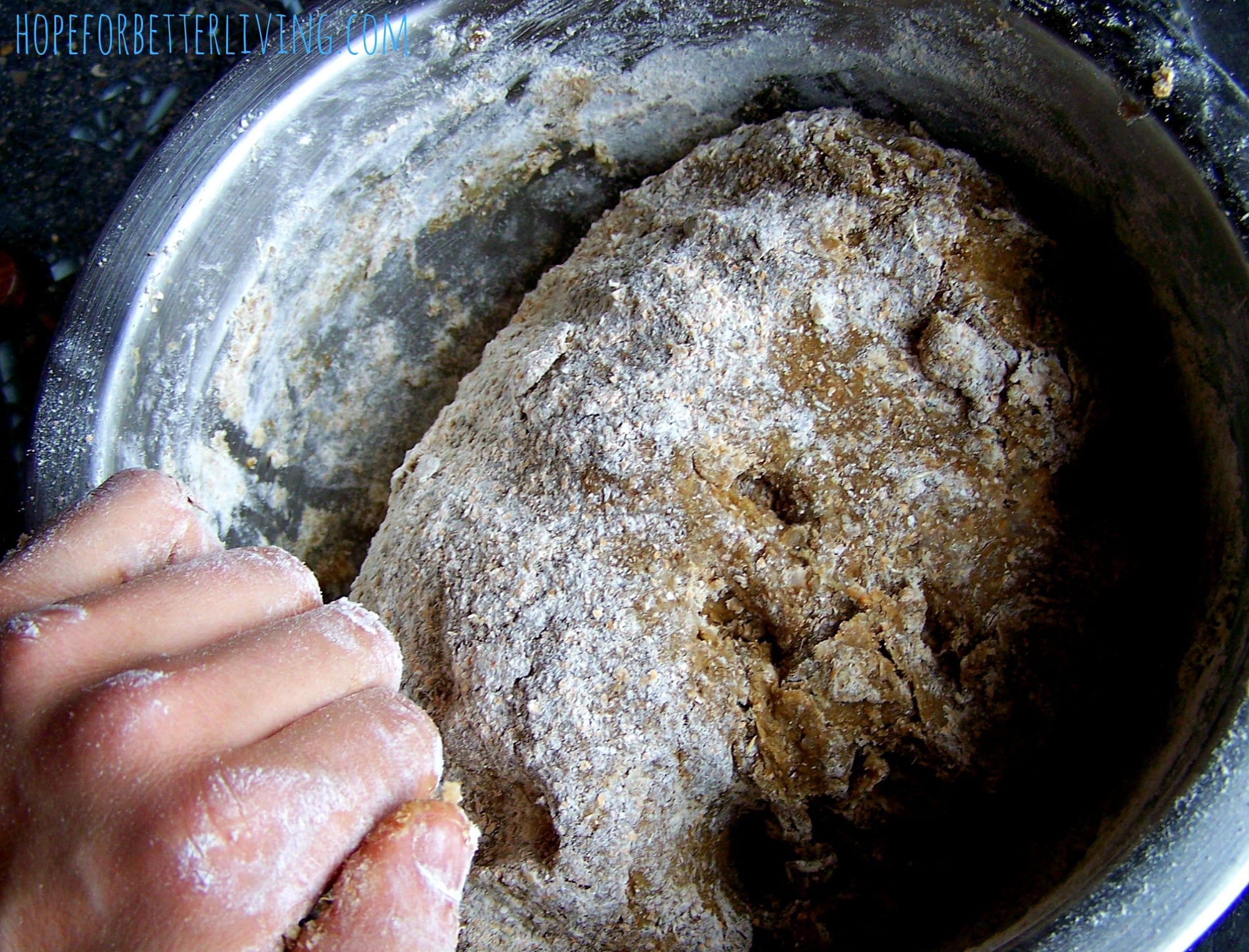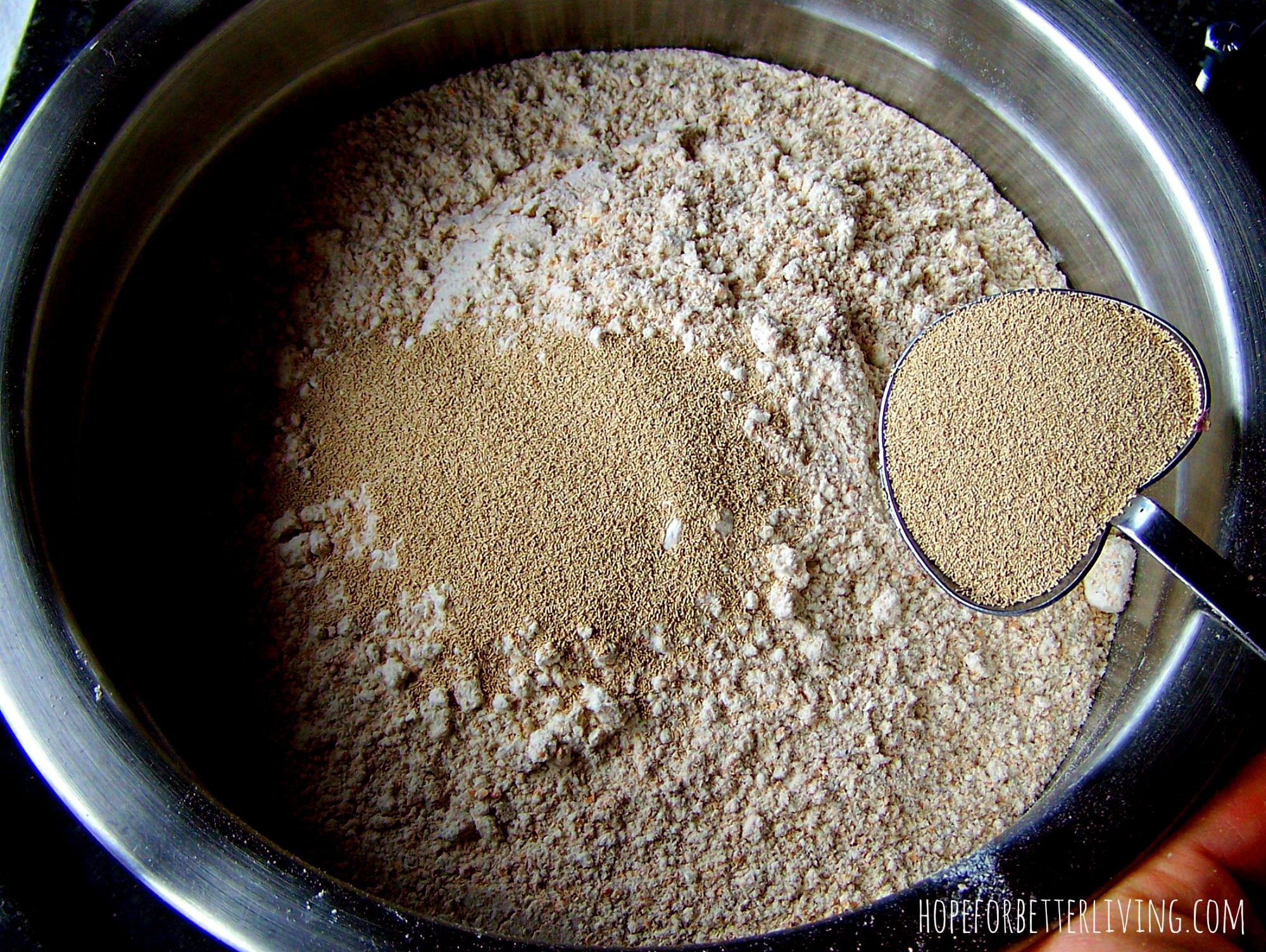 Place freshly ground spelt flour in a bowl. Mix in 2 Tbs of yeast and 3 tsp of salt.