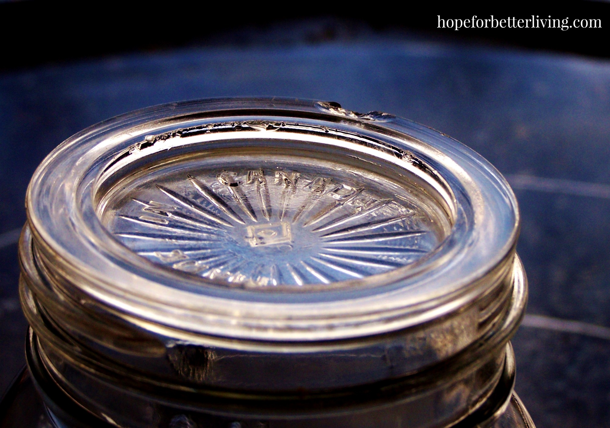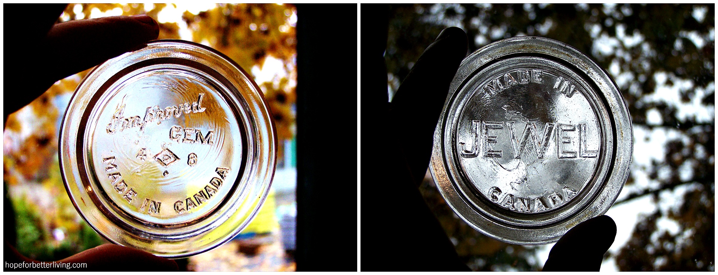 If searching for these jars at thrift stores, in garage or estate sales, they can be easily recognized by their thicker glass, medium sized lid and distinct labels. Among the common inscriptions you’ll see “Improved Gem,” the “Dominion Gem” or plain old “GEM.” Jewel jars have a standard “Jewel Jar” and “Canadian Jewel” as their inscription. Really, if you see “Gem” or “Jewel,” anywhere on a jar, you’ll want to buy it for all-glass canning (to the best of my knowledge)! Most of the inscriptions include “Made in Canada.”