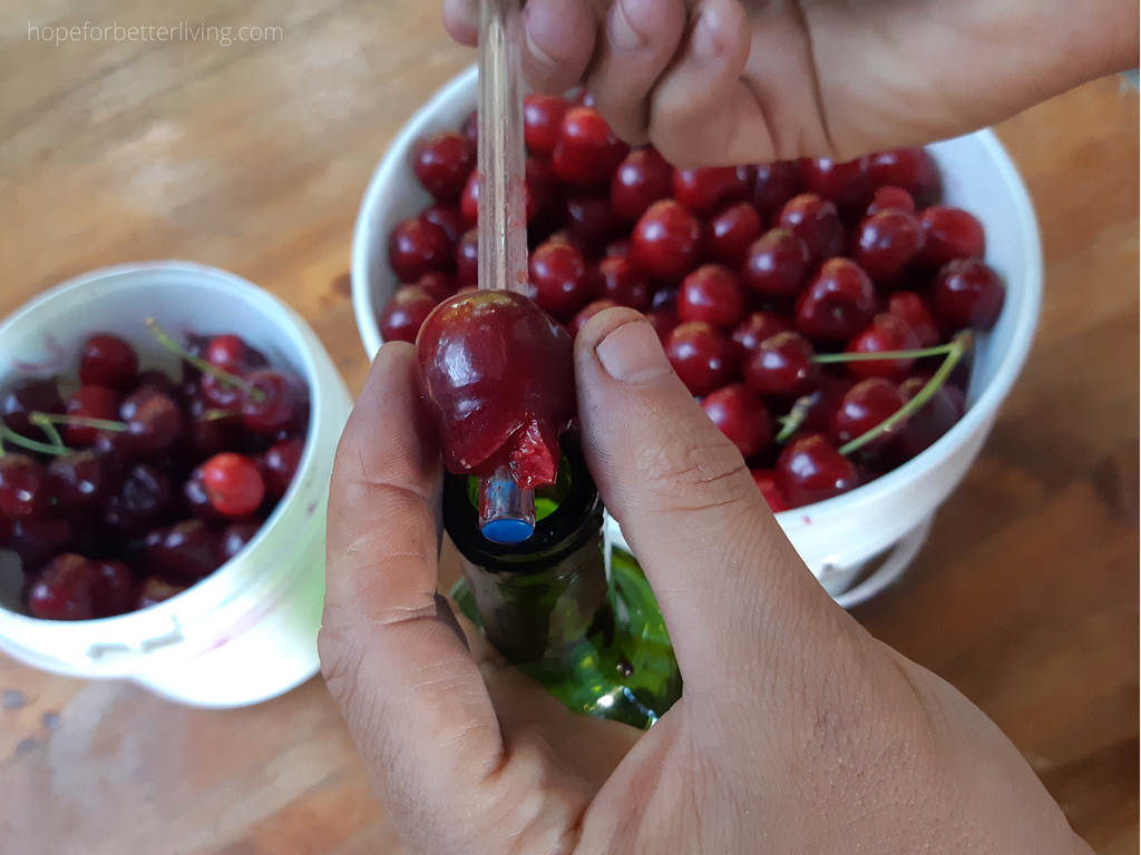 A homemade pitter is easy to make. You'll need an old wine bottle and a chop stick. Or the back end of a (clean) pen will do!
