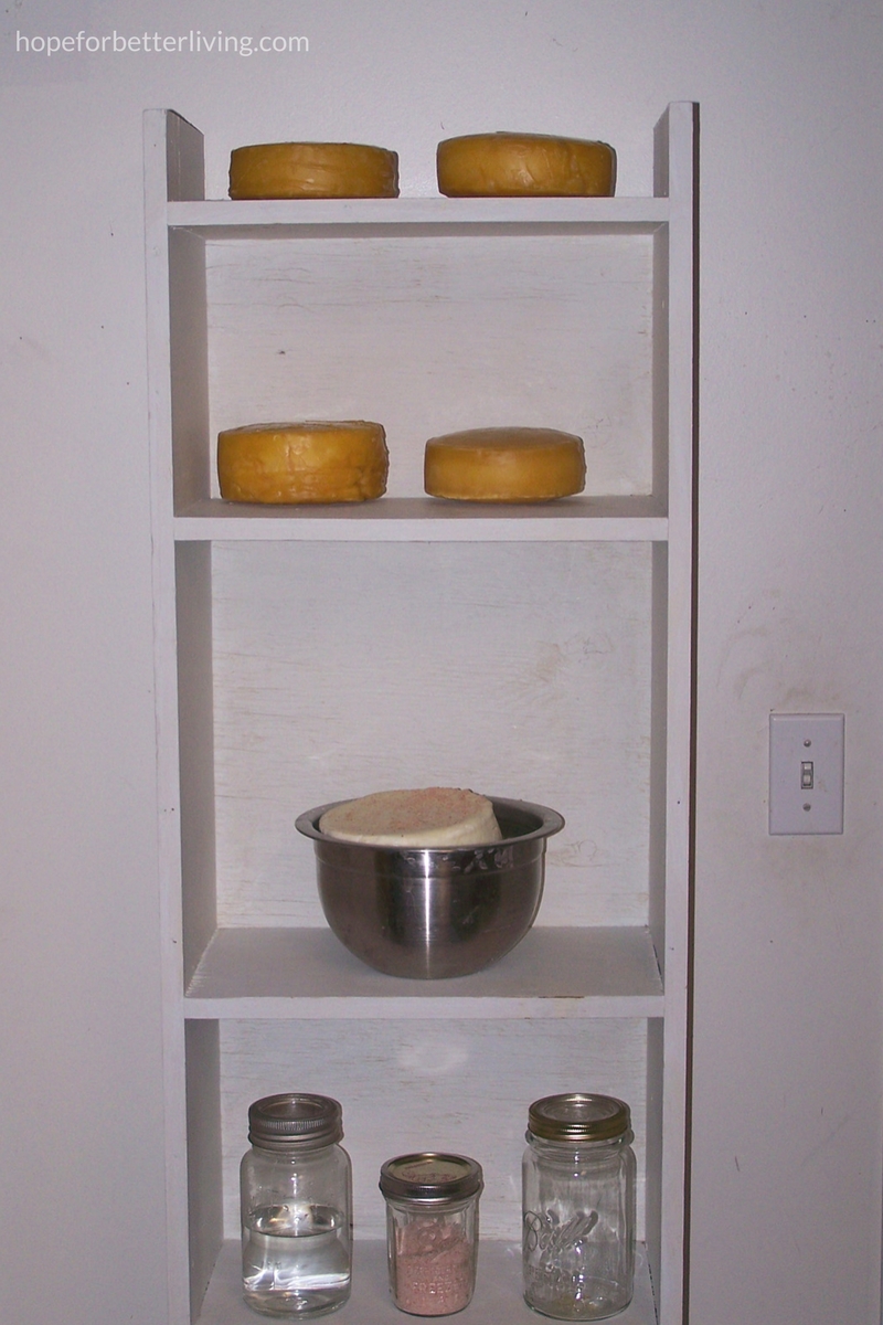 While the cold room doesn't always hold to steady temperatures, homemade cheese can be cured in this small space. In the corner of our cold room, a small dairy shelf holds waxed cheese wheels.