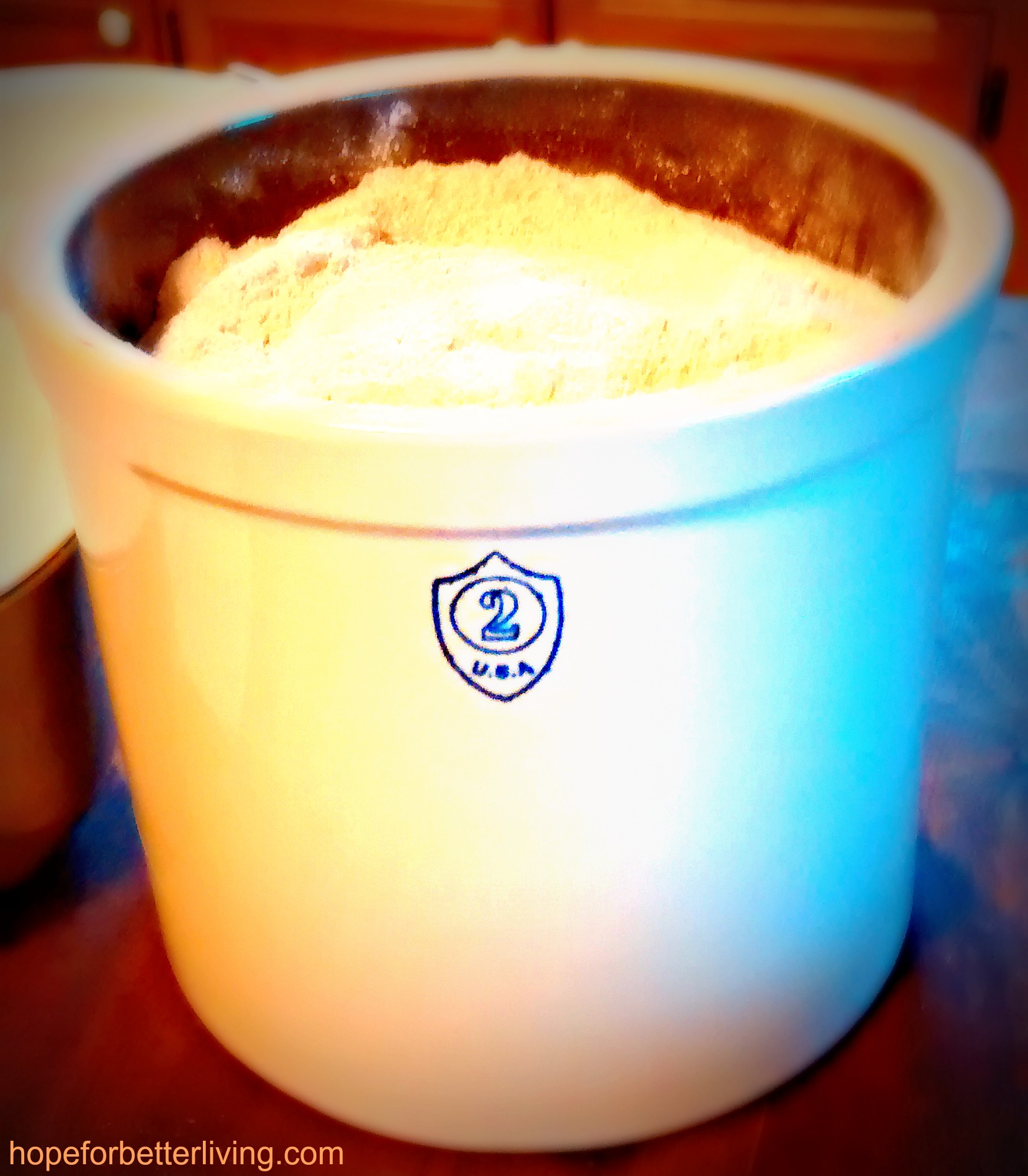 For a traditional approach, send wheat through your flour mill until you have approximately (give or take) 30C. Place half of the fresh flour in a container of choice. I recommend using a crock since it holds to cooler temperatures. You can purchase USA made open-mouthed crocks for relatively cheap. They work beautifully!