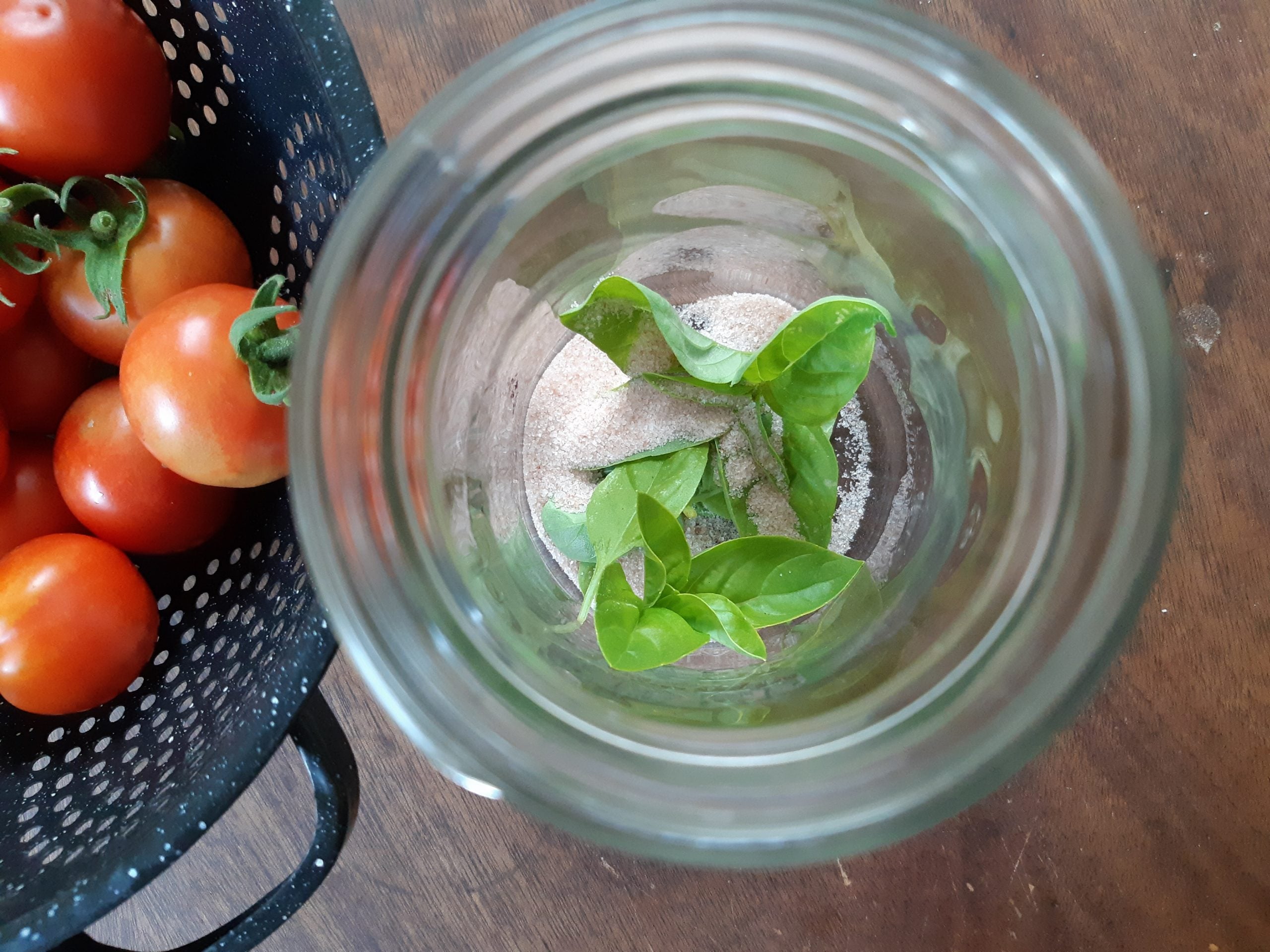 Add water, until tomatoes are covered. Tightly fasten down a lid, then gently tip the jar back and forth from end to end, until salt is dissolved.
