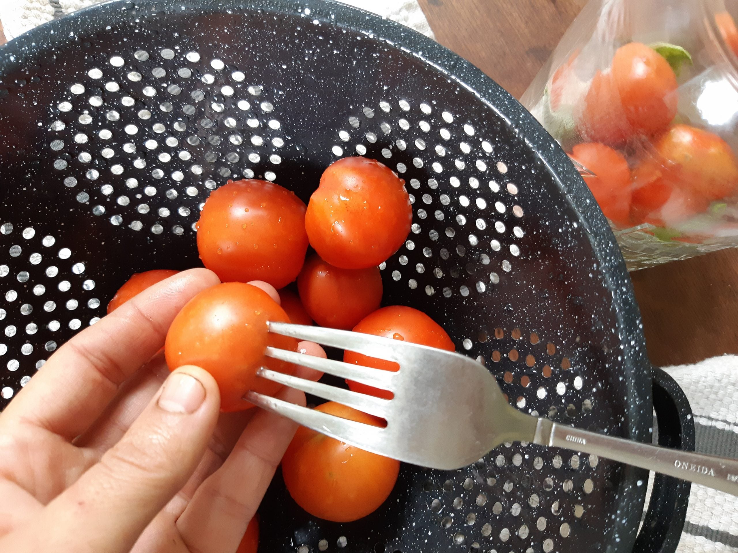 In a clean jar, place the 3 teaspoons of salt, plus fresh herbs, garlic or onions (if using). Rinse tomatoes clean and remove green tops. Poke each tomato 2x with a clean fork, then pop each one into the jar.