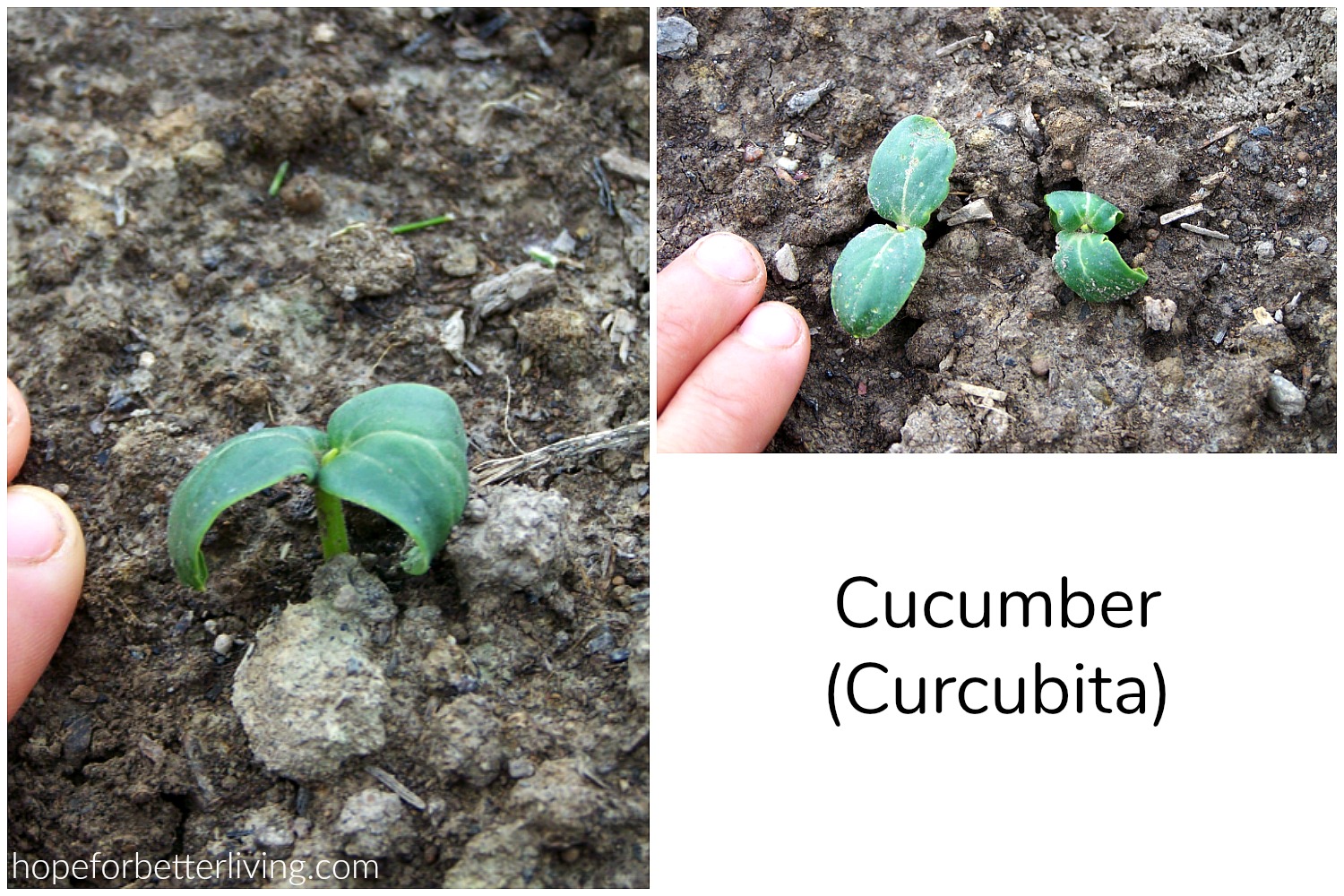 The squash family seedlings are very large and while the young plants vary in size (cucumbers are smaller than zucchini or pumpkin), they all have the same distinct, large green leaves growing opposite one another on their short stems. The list includes: