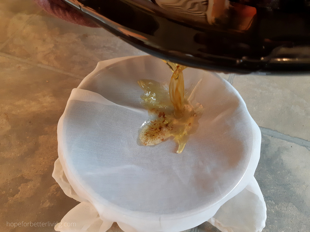 Using oven mitts, carefully lift the crock and slowly pour hot wax into the tin bowl. The cloth will catch bits of debris as the liquid wax slips between the fibers of the cloth.