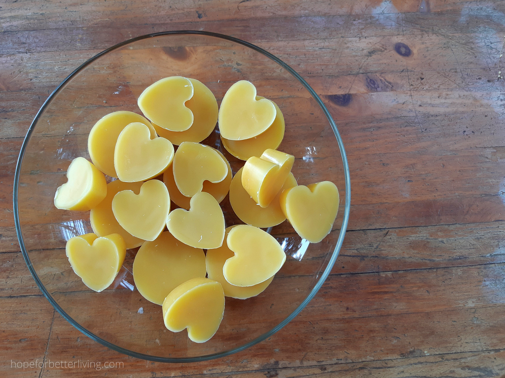 Set your molds on a tray. I use these silicone ones for a number of things in my home. When filled, each heart holds 1.55 oz (45 gm) of hardened beeswax.