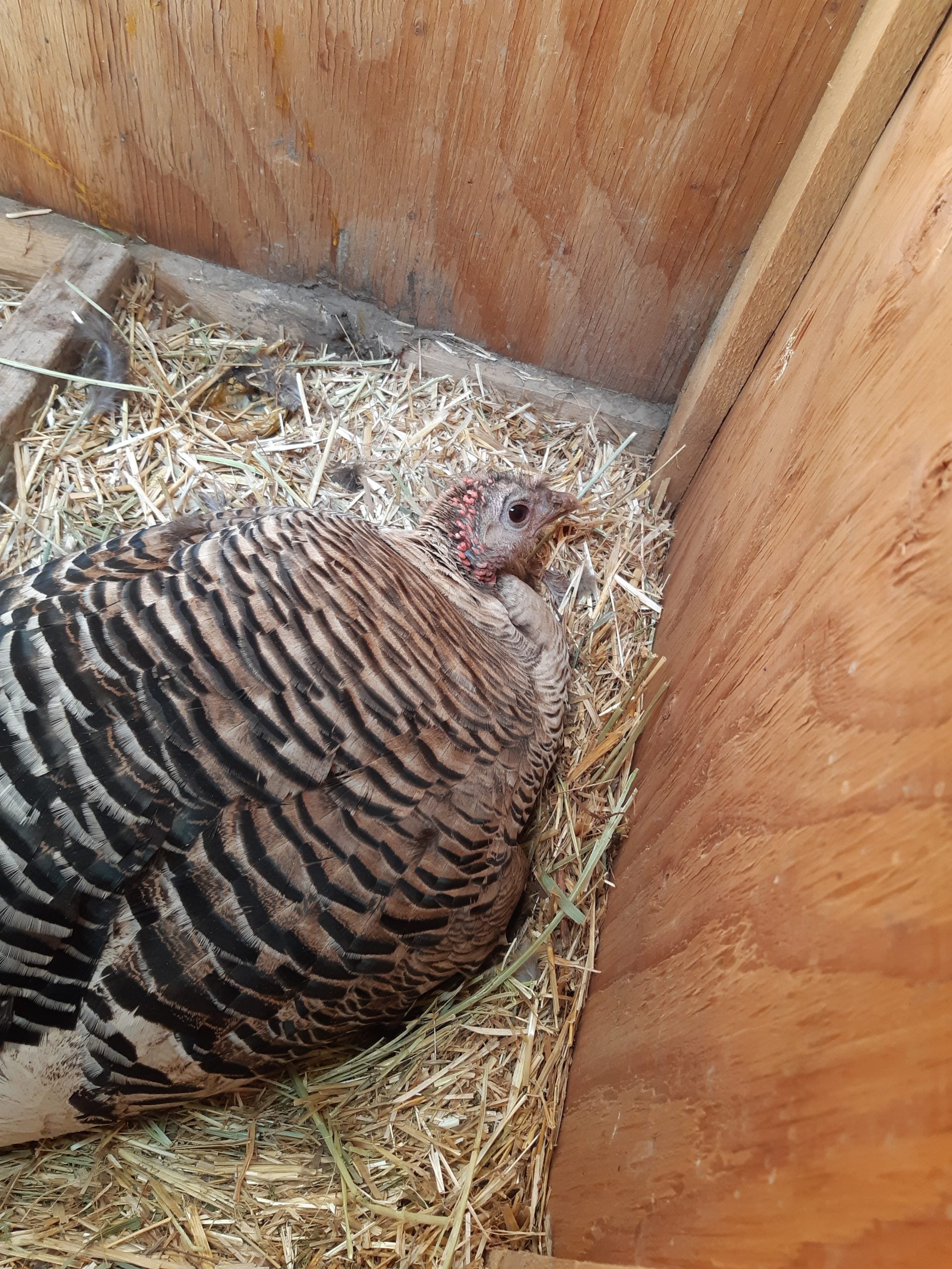 So it was. Our tom had been missing for about a week. A dog had gotten hold of him and we found feathers all over the grounds. Not sure if he was dead or alive, we searched but without luck. Our escaped birds have always returned home within a few hours. Food, water, good roosting and friends are inside! What's not to love?