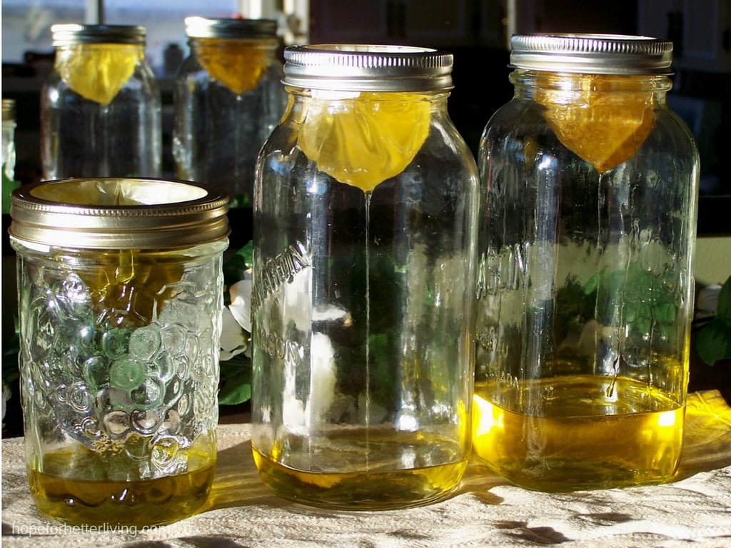 In a clean pint (500 ml) jar, place the dried herbs of choice. I recommend filling it half full of dry matter. Pour your oil over the dry plants until oil rises 1 inch over them.