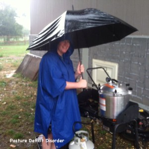 Whether you have beating sun or pouring rain during the summer months, a covered canning kitchen is a wonderful thing! Whether a permanent or temporary structure, ensure that you will be able to adequately see the job through to the finish. Cheryl of Pasture Deficit Disorder has it right: when processing food outside, large umbrellas are a wonderful thing!