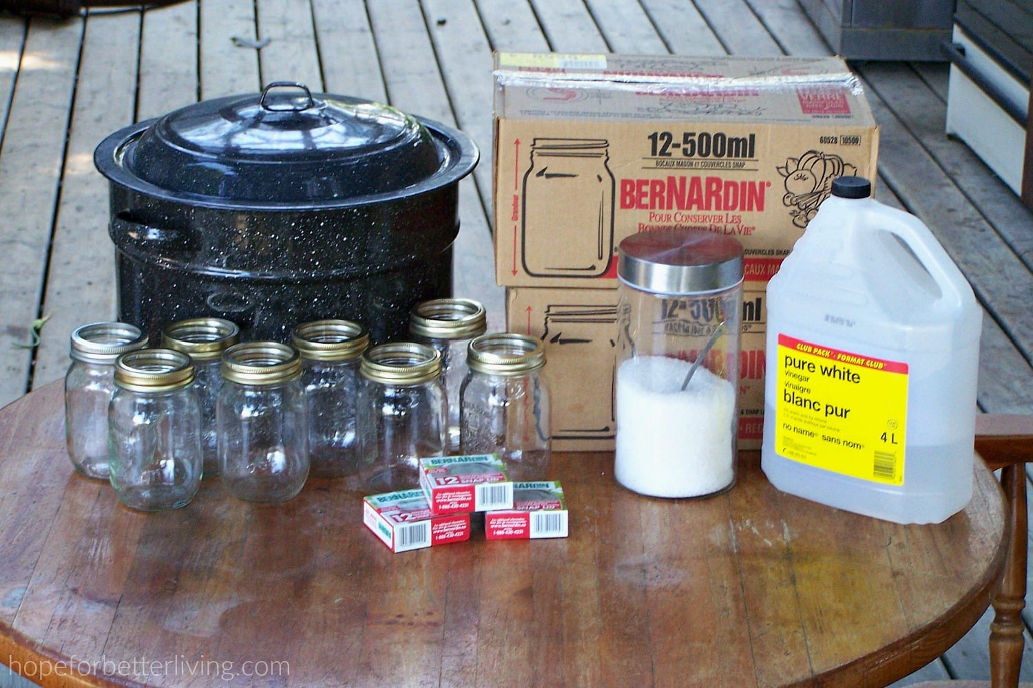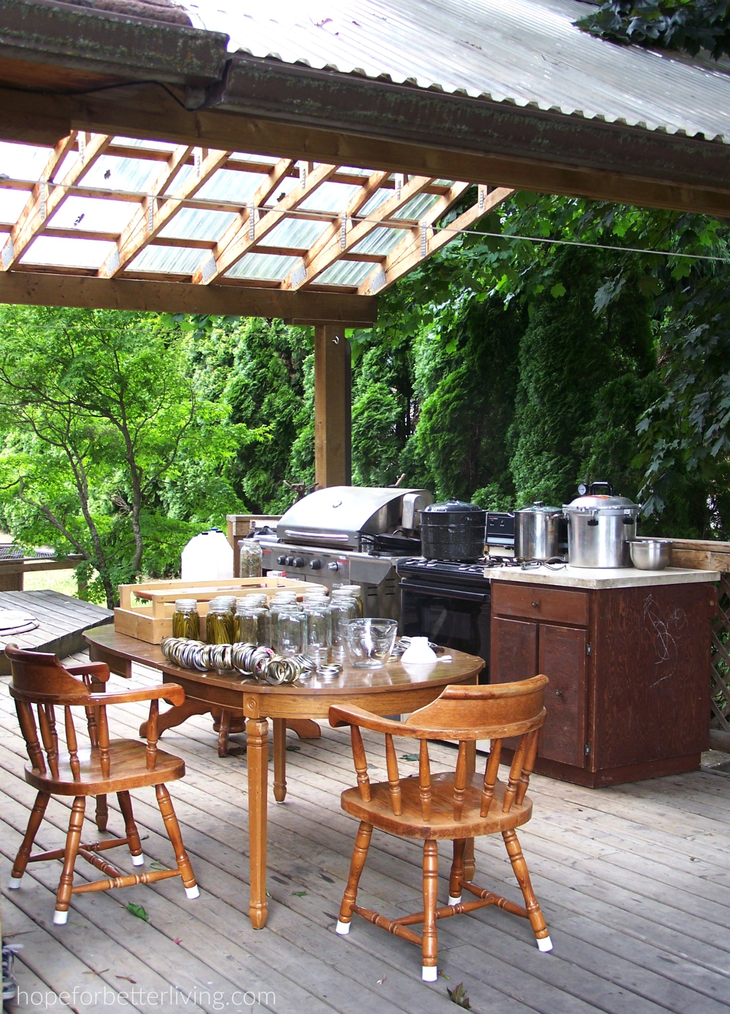 I was delighted to find an outdoor covered kitchen just off the dining room of our rental home! After lugging an old table outdoors, heaping it high with canning supplies and lighting the gas stove beside the roll-away counter, I could preserve food in all seasons, in all kinds of weather.