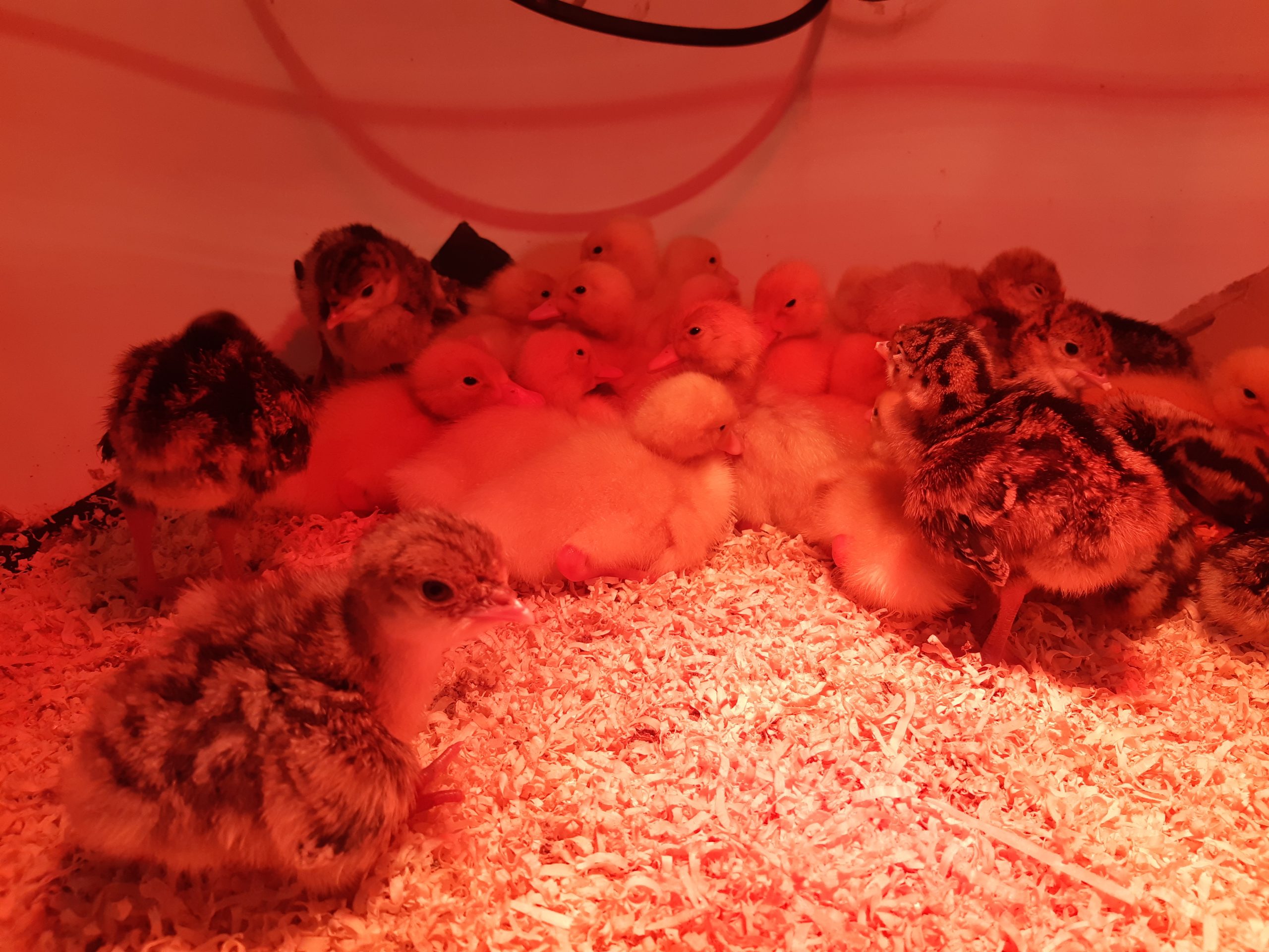 In the box, our turkey poults and ducklings have access to feed, water and a heat lamp.