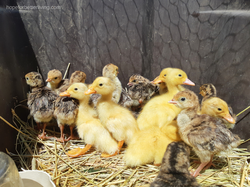 There's nothing so cute as a mix of ducklings and turkey poults snuggled together under a heat lamp! While ducklings are slightly larger in the beginning, they seem...compatible.