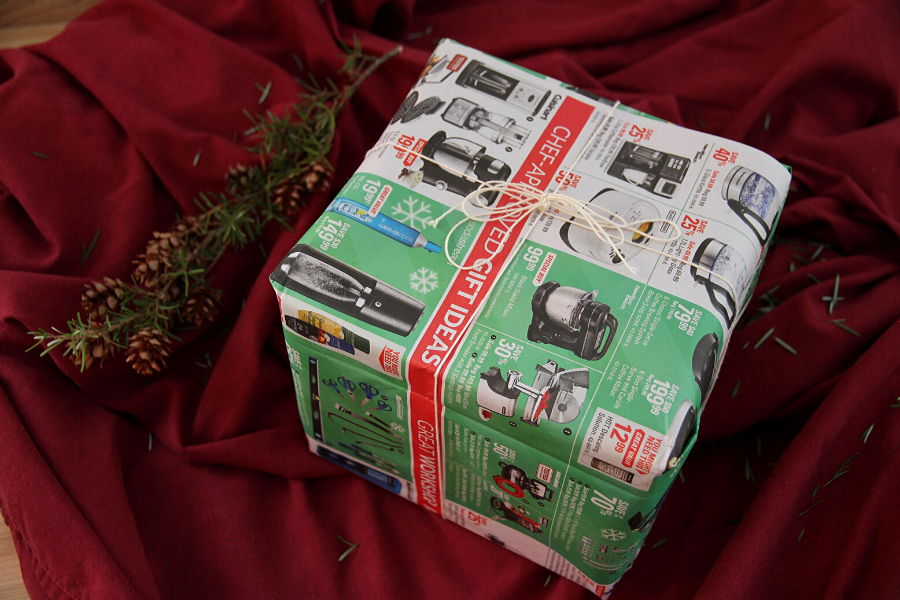 According to my man, most fellas don't care about prettily wrapped gifts. The only important thing is the item inside! So why not wrap his gifts with the flyers and newspapers that flood your mailbox, come Christmas? It's a wonderful way to use them up! And if you feel that more chaos and color is necessary, add a bit of colored yarn or ribbon.